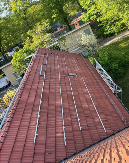 Zuerst wird das Dach am vorgesehenen Installationsort der Solaranlage abgedeckt – eine saubere Vorbereitung ist hier entscheidend. Anschließend erfolgt die Montage der Einfassung, sowohl unten als auch seitlich, um den Einbau professionell abzuschließen. Im nächsten Schritt wird entweder die Unterspannbahn oder das entsprechende Abdichtungssystem installiert, damit alles zuverlässig geschützt bleibt. Danach werden die Tragschienen montiert und die Solarpanels fachgerecht angebracht. Abschließend erfolgt die Installation des Stromwandlers und die Anbindung an das Stromnetz. So ist die Solaranlage effizient und sicher betriebsbereit.